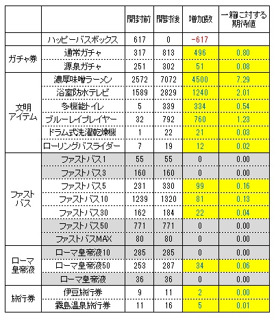 ハッピーバスボックスからでるアイテムの現在の所持数をカウントしたのが下記です。
