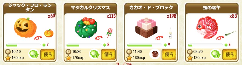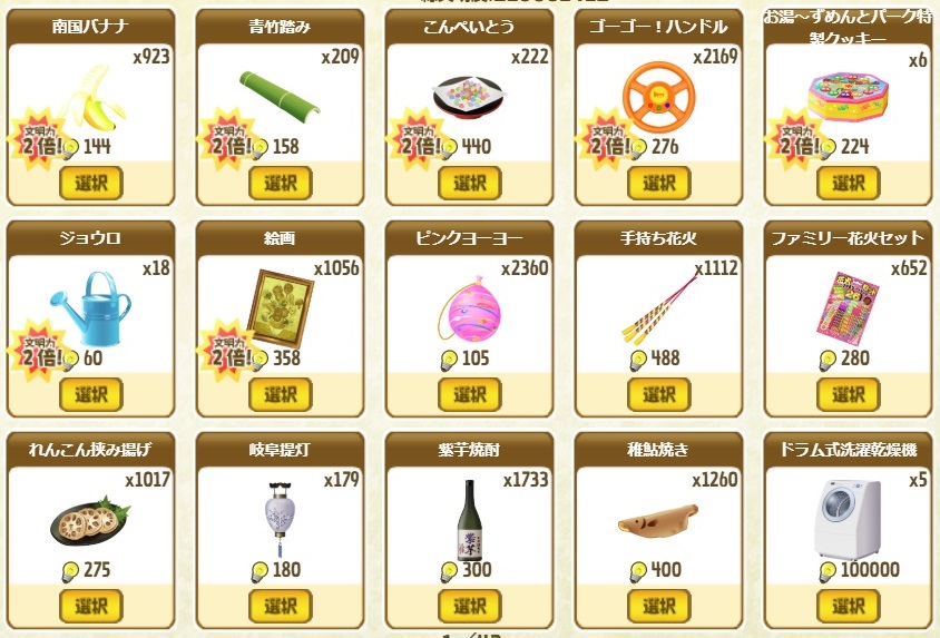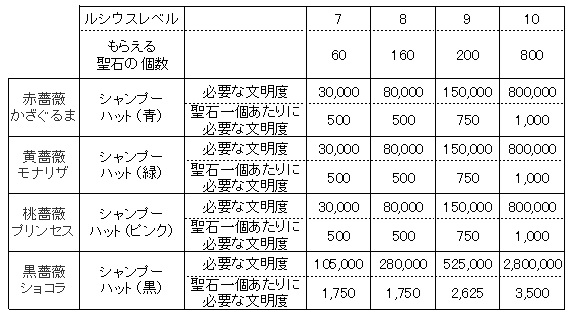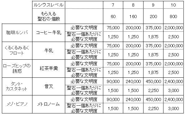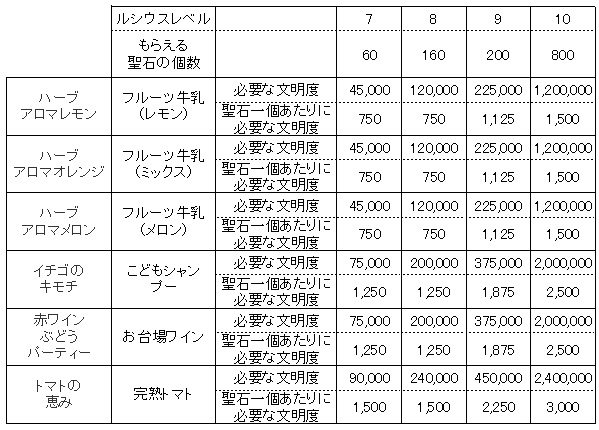 レベルがあがるほど、必要な文明アイテムが増え、もらえる聖石の数もかわります。