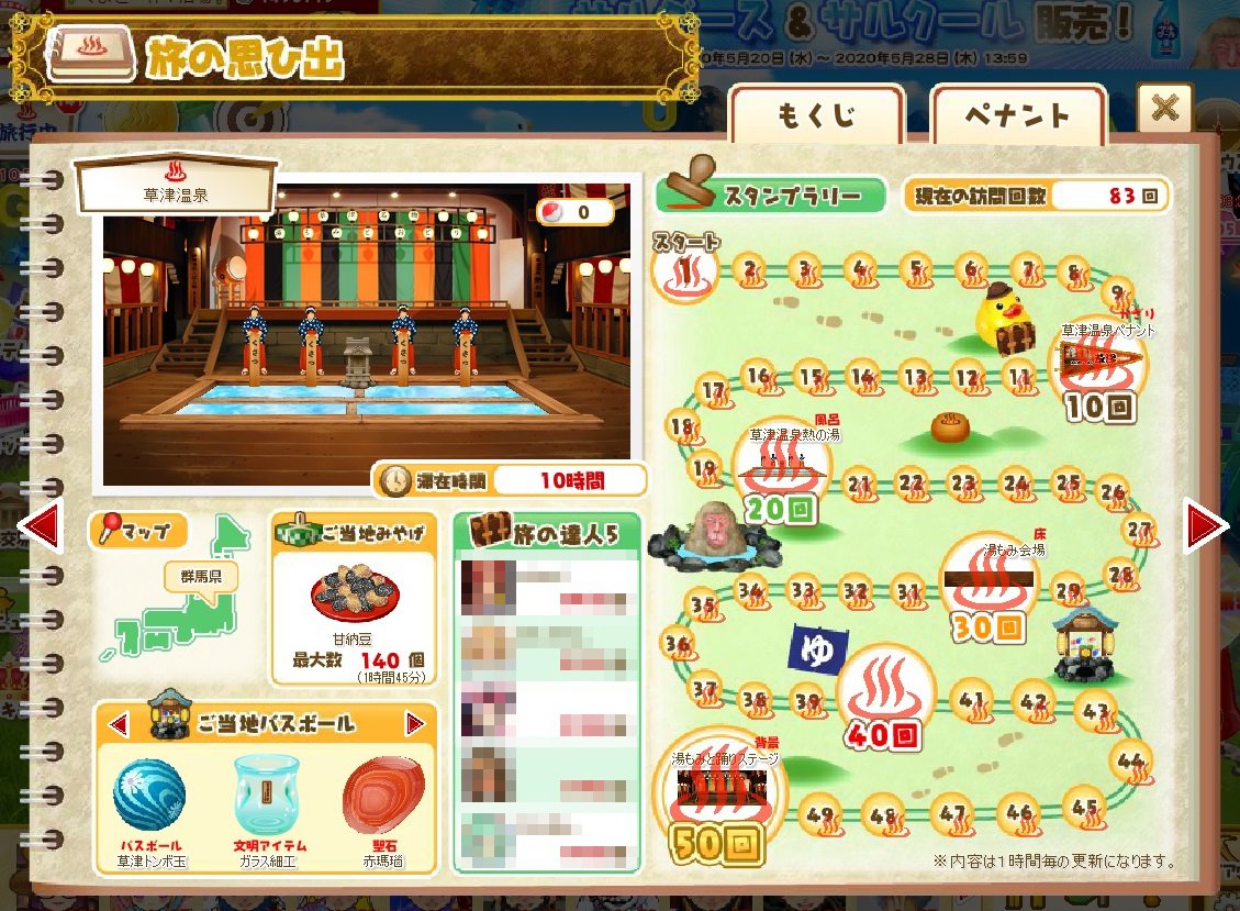 10回同じ温泉地に行き、一回もガチャを回さなければ、10回のガチャ券がたまります。