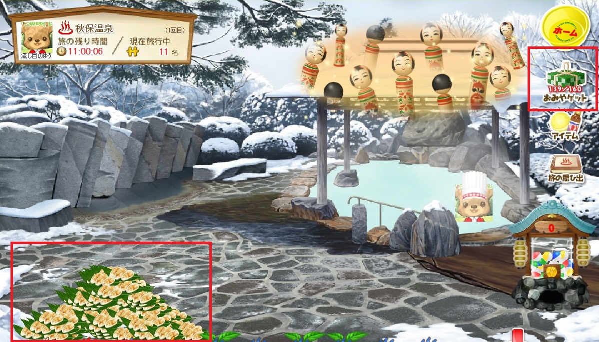 ☆温泉地などを訪問してもらえるお風呂は、抽選風呂で、主に温泉のおみやげが選べることが多いようです。